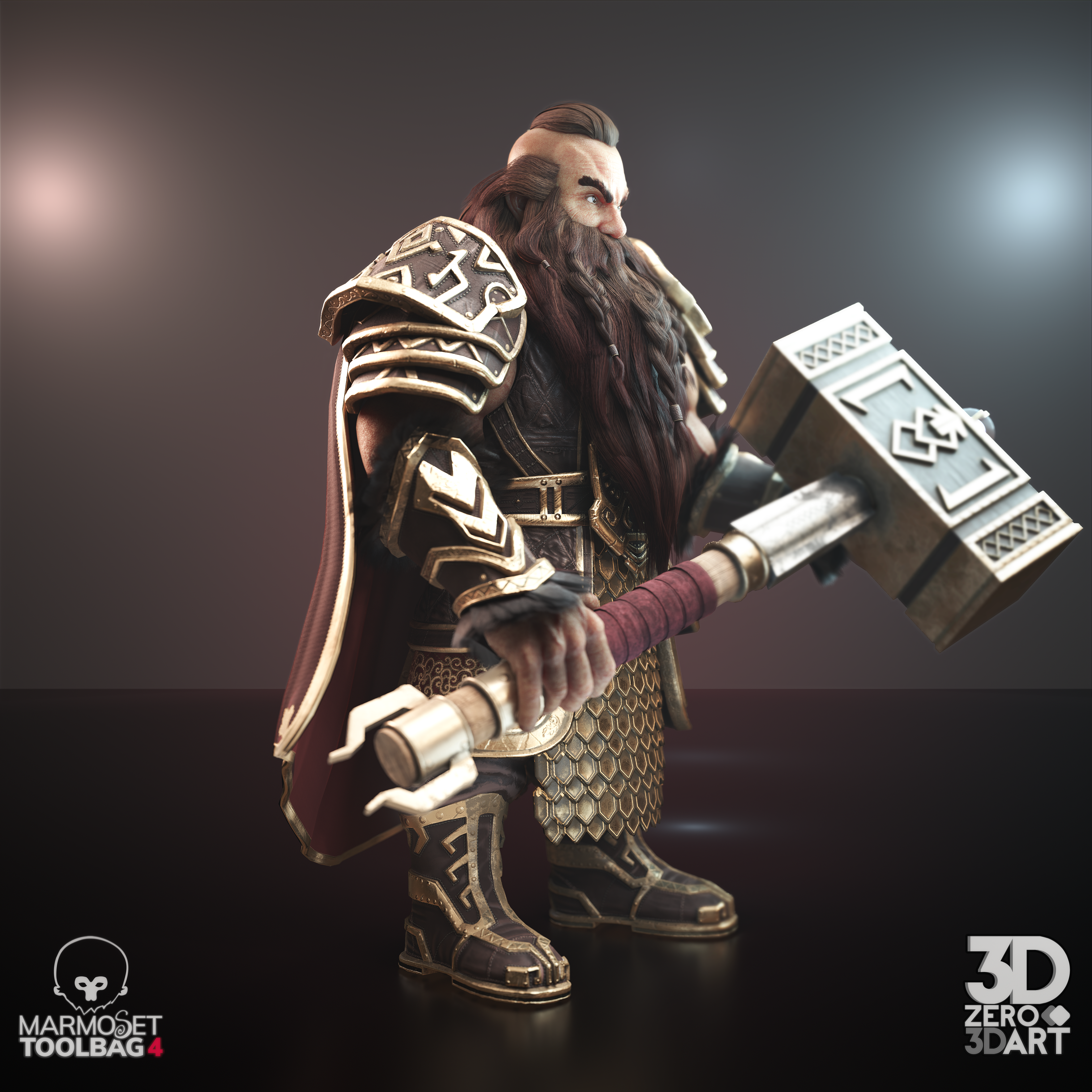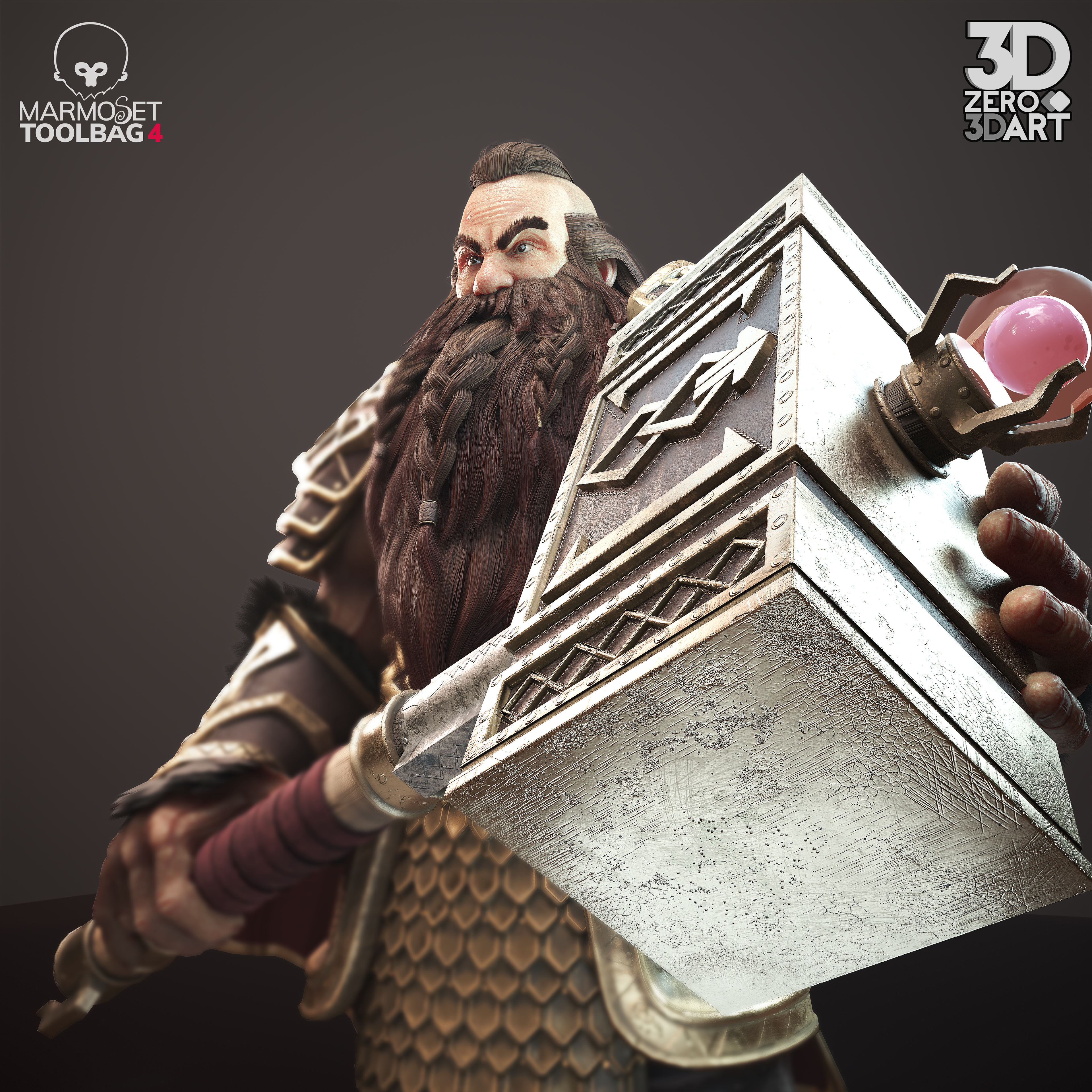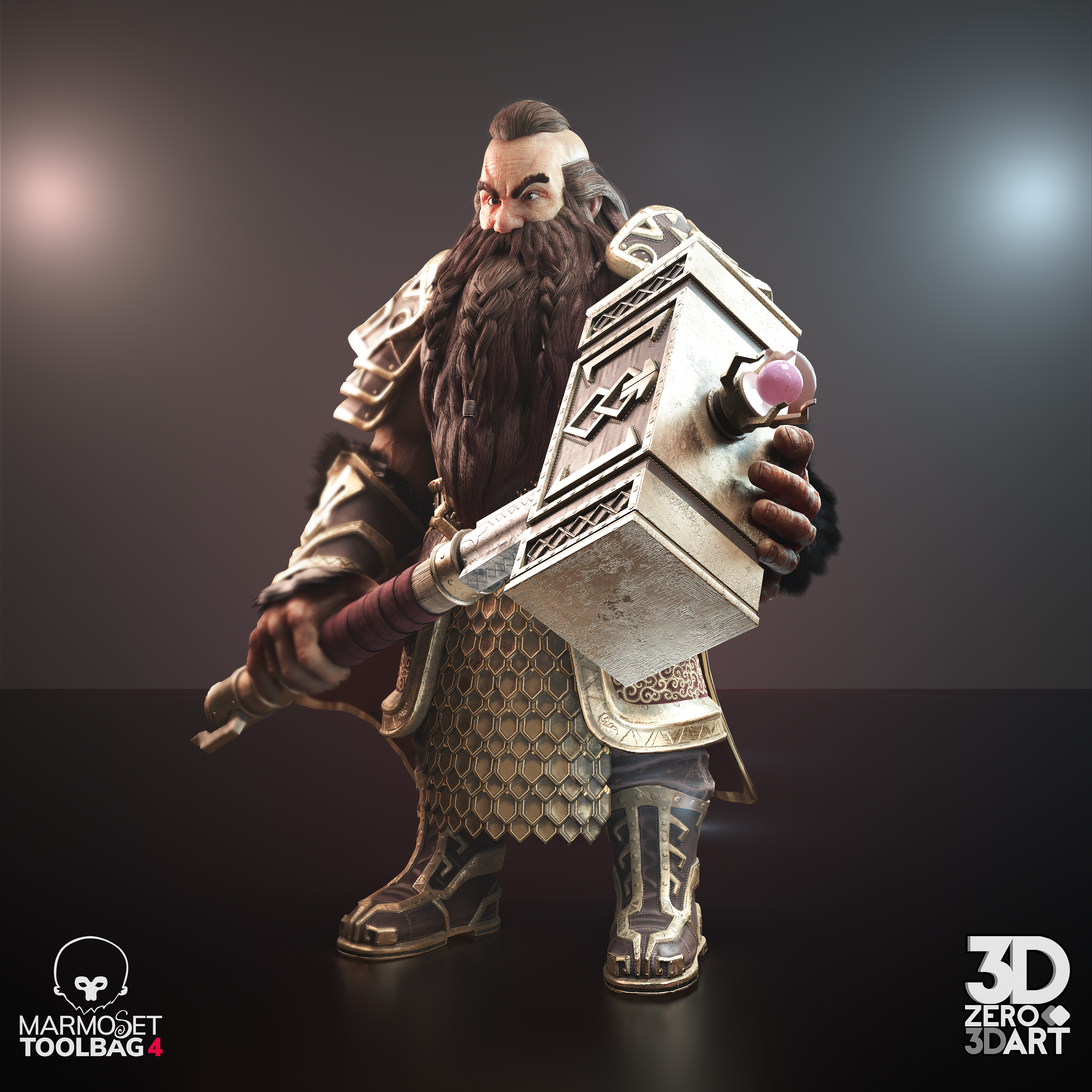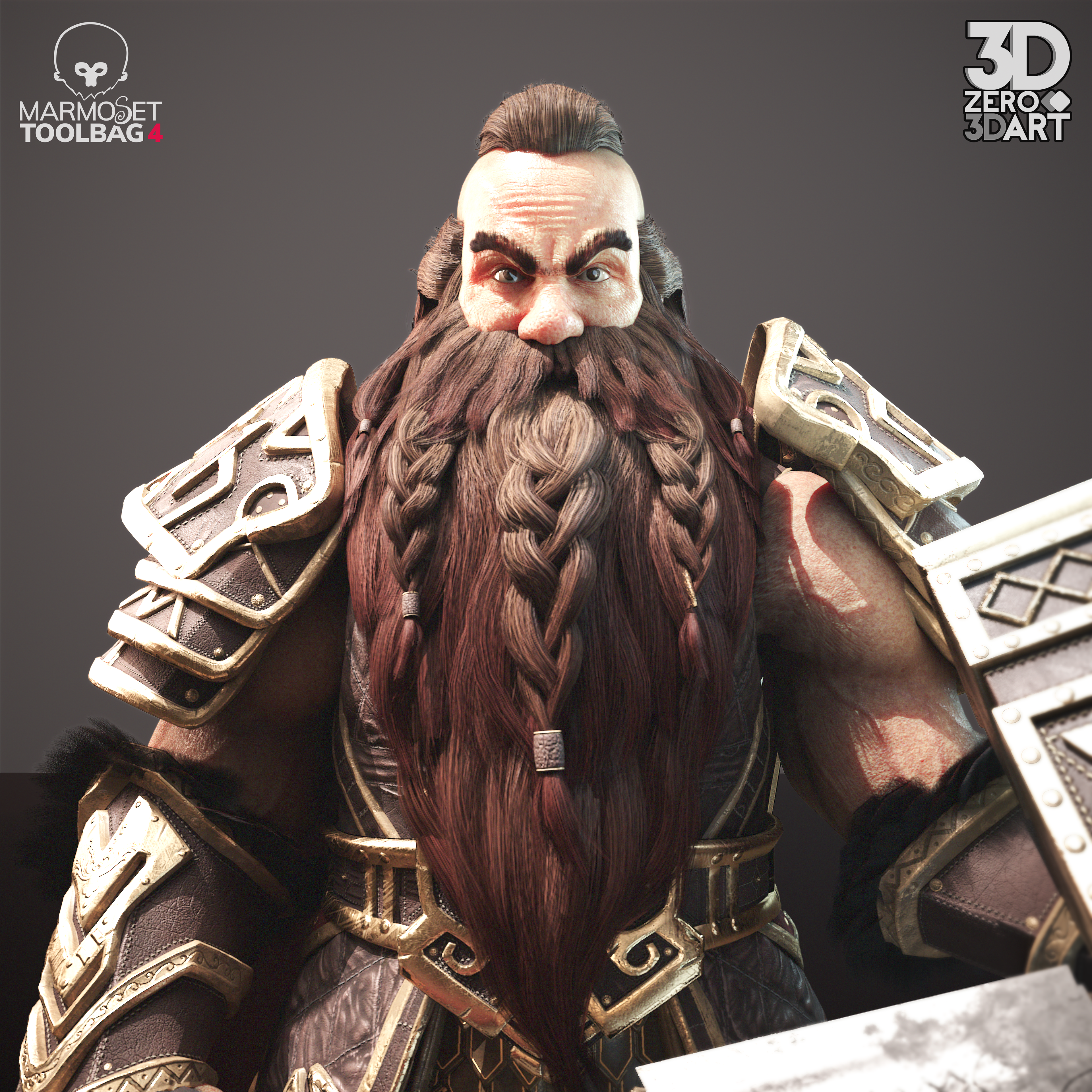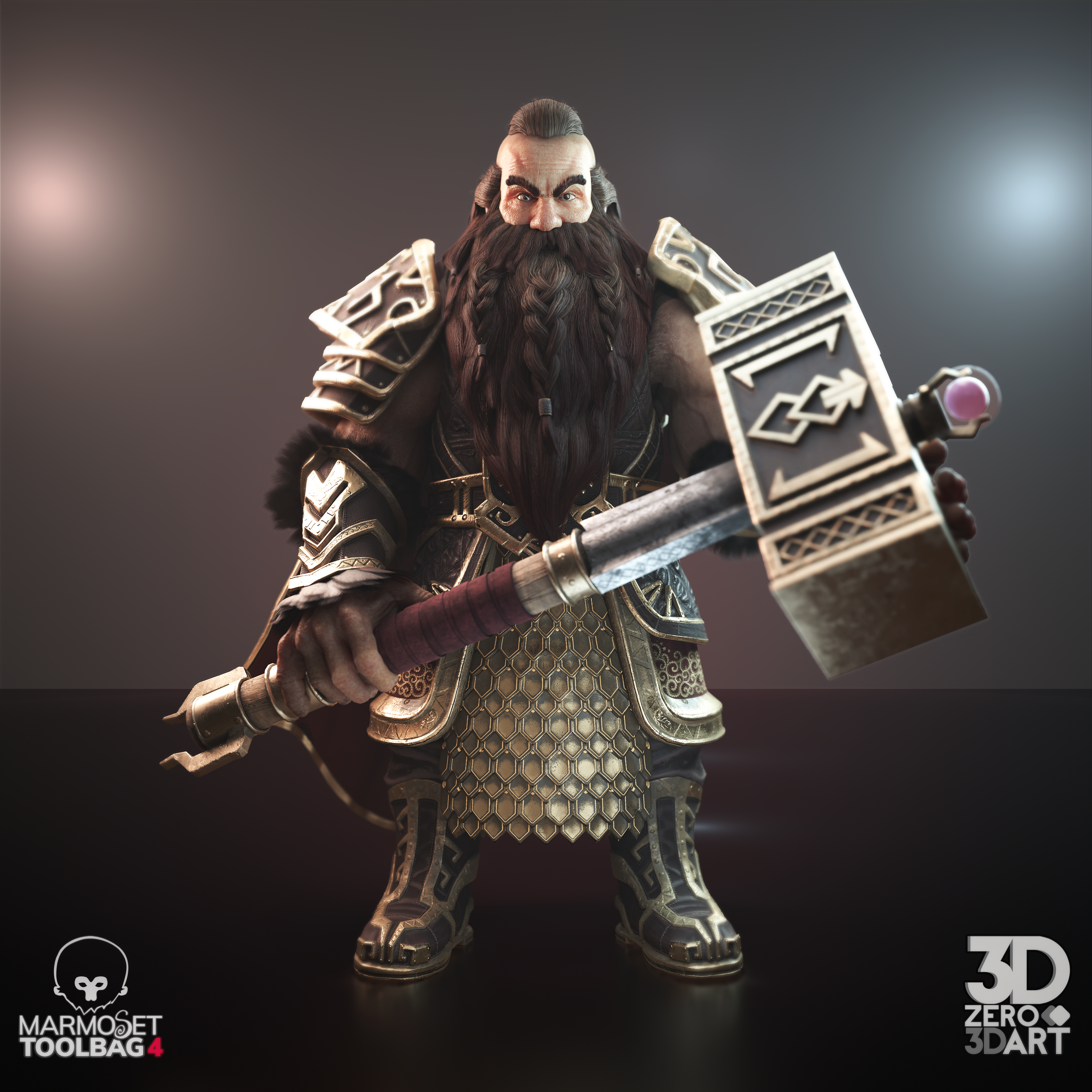 Dwarf Warrior, a game ready character made in the month of June 2022. Sculpted with zbrush, retopo and hair cards placement with Maya, texture with substance painter, hair and fur textures with fibershop and rendered in marmoset Toolbag 4.